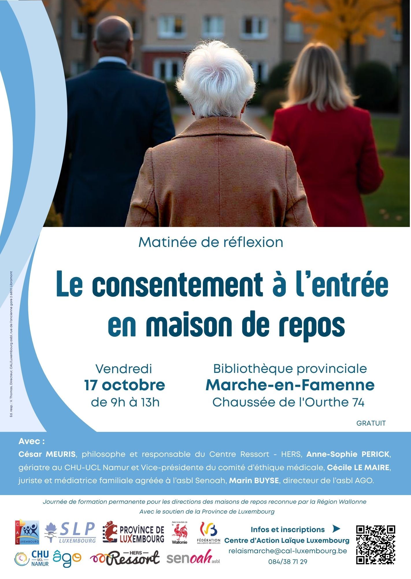 Le CAL/Luxembourg et le SLP Luxembourg organisent une matinée de réflexion et d’échange sur le thème du consentement à l’entrée en maison de repos. Cette rencontre se tiendra le vendredi 17 octobre 2025, de 9h à 13h, à la salle provinciale à Marche-en-Famenne.